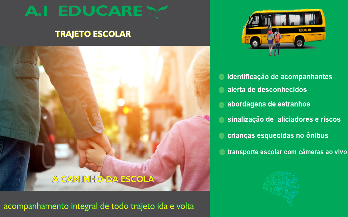 Pais, alunos, professores, colaborares, prestadores satisfeitos com os recursos avançados da solução AI Educare; acompanhamento de tudo , de ponta a ponta, o translado das crianças, transporte escolar monitorado ao vivo, interações com estranhos, até o retorno seguro ao lar.